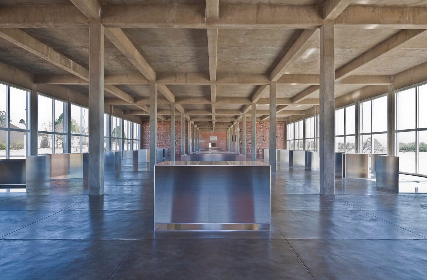 There is no place on earth that I enjoy more than the spaces inside and around the two former artillery sheds at the Chinati Foundation, which house Donald Judd’s 100 untitled works in aluminum. So, it’s easy to put the Chinati and Judd Foundations at the top of my list. Created between 1982 and 1986, each aluminum unit measures 41 x 51 x 72 inches, with variations in the structural composition of each of the units.